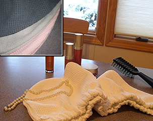 The Turban : Swedish Microfiber hair wrap enables you to cut hair drying time in half - it quickly absorbs water from hair after showering and swimming. Waffle Weave “hood” absorbs water from hair quickly after the shower or swimming. Loop and button to secure wrap on the head with a twist of the fabric. |